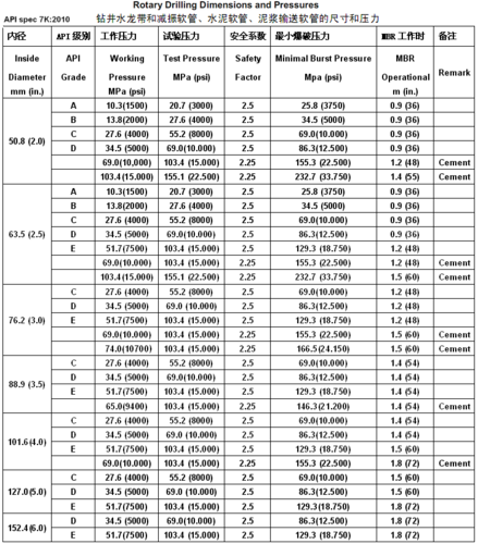 旋轉(zhuǎn)鉆探軟管用在立管頂端與上下運行的旋轉(zhuǎn)節(jié)之間。海洋泥漿輸送軟管用在駁船與海洋鉆井平臺之間的高壓泥漿輸送,長度通常大于13.5m。